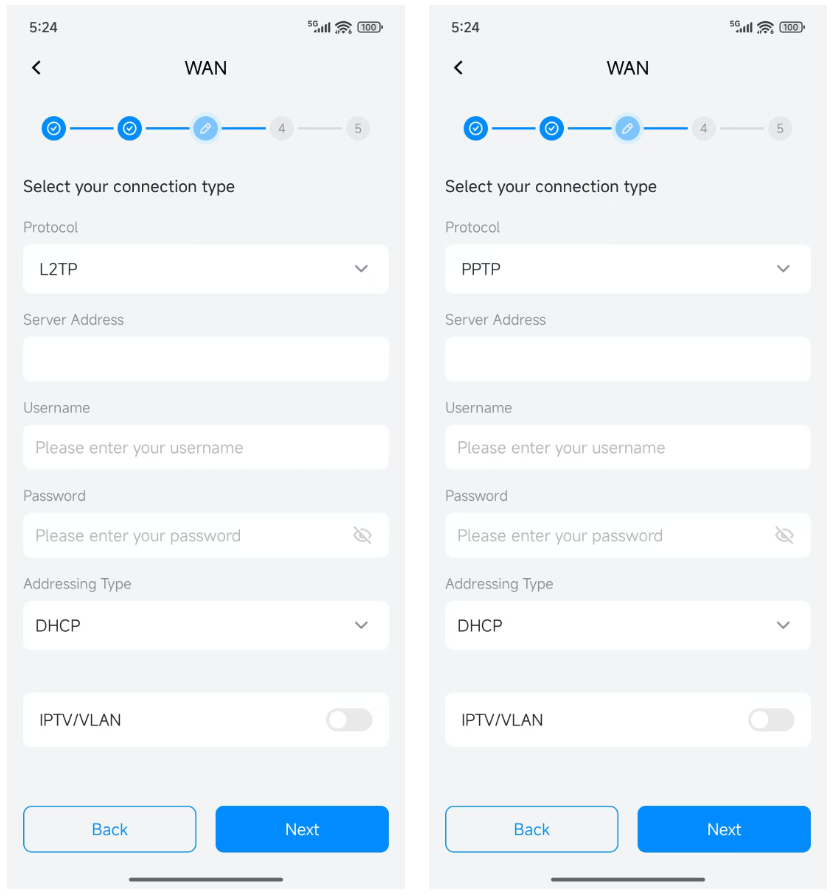 L2TP and PPTP are VPN protocols and can also be used for WAN connection. They are not a common protocol. You must input proper parameters to access the internet.