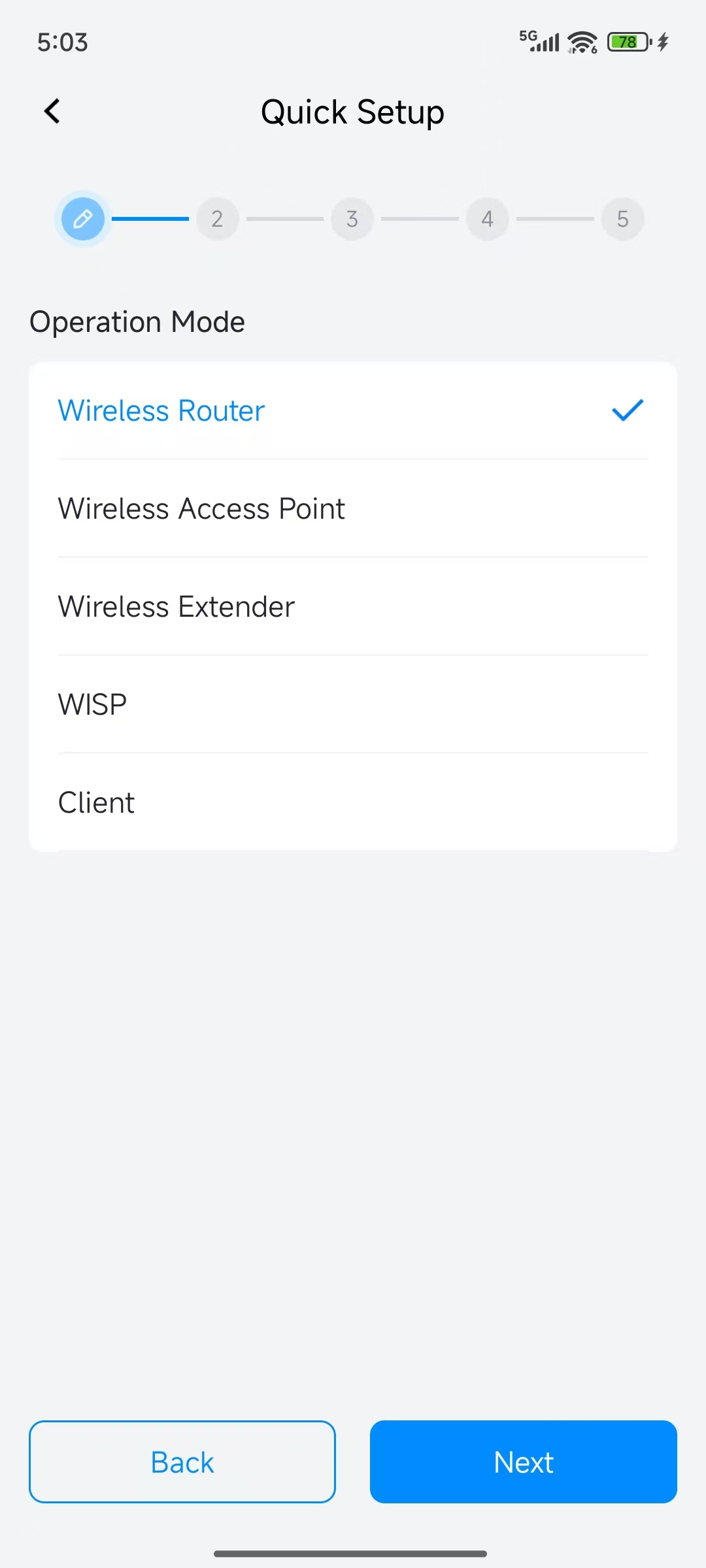 The Quick Setup will auto-launch. Choose the "Wireless Router" mode and tap "Next".