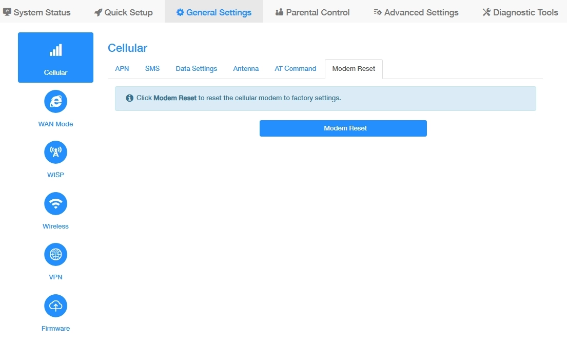 Click Modem Reset to reset the cellular modules (4G/5G) to factory settings, which may help to restore connectivity during network failures or configuration errors.