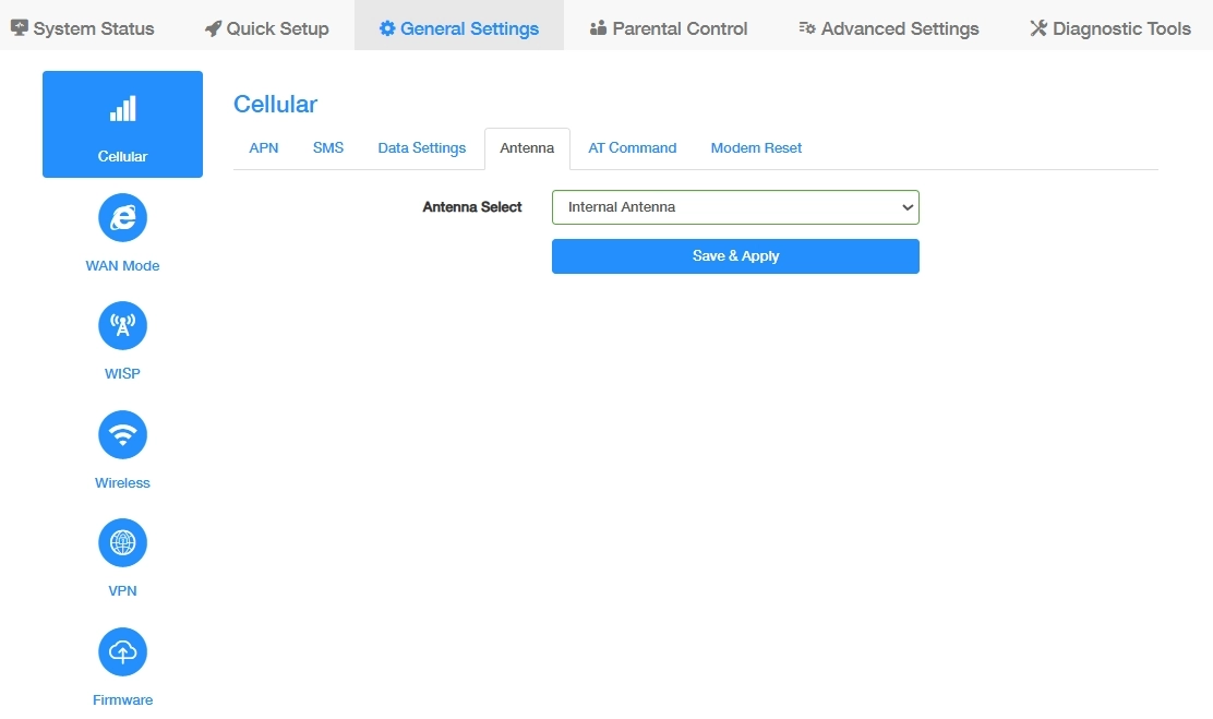 Select the type of antenna used for the cellular connection, and click Save & Apply.