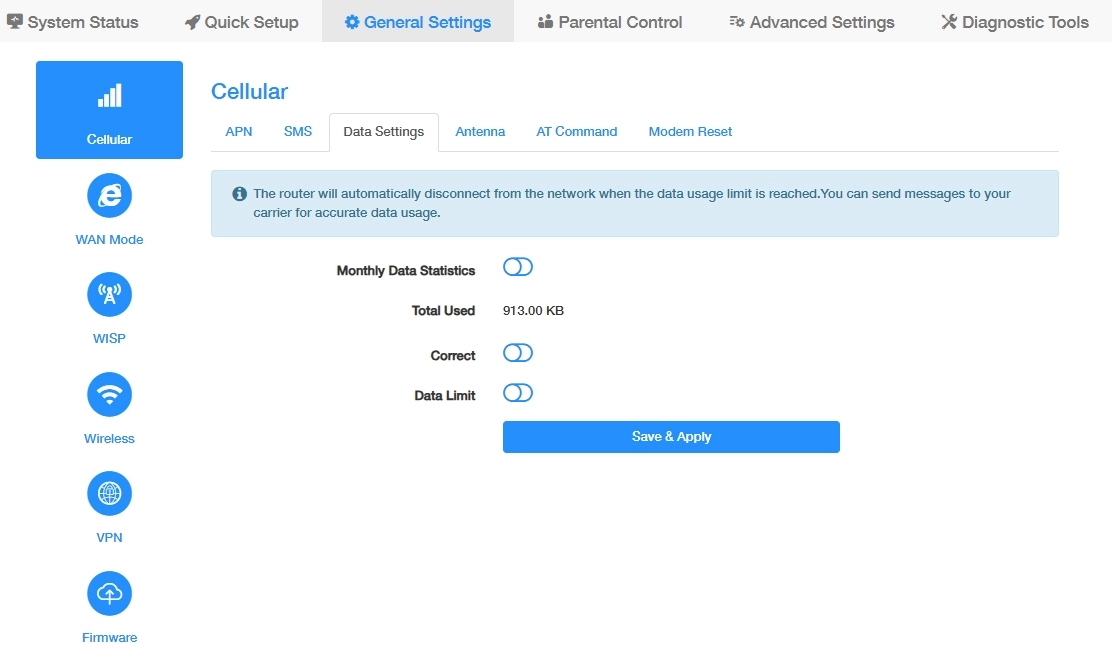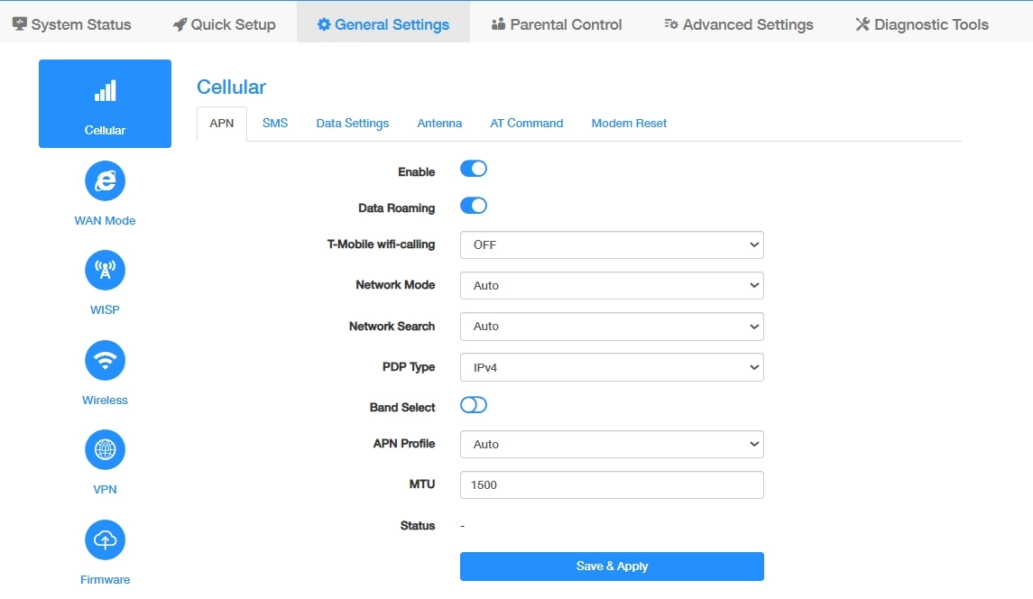 - Click Save & Apply to save and activate the new settings or changes. Status will display the current state of cellular network connectivity, Connected or Disconnected.