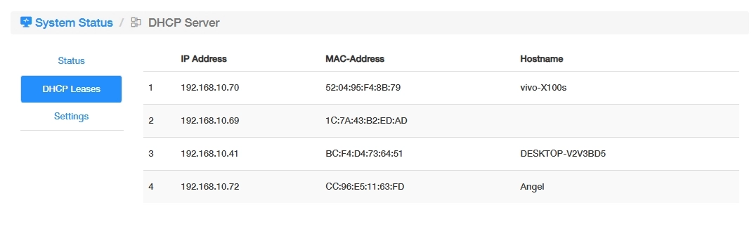 Go to System Status -> DHCP Server -> More Details -> DHCP Leases to view the list of clients which the Router being a DHCP server has allocated an IP address to, including such information as IP address, MAC address and Host name.