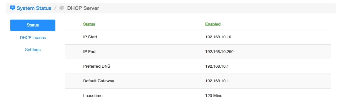Go to System Status -> DHCP Server -> More Details -> Status to see it is Enabled or Disabled as well as its IP address and subnet mask. Click More Details to know more information about it or make changes on Settings page.