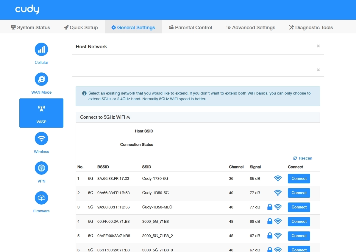 Determine 5GHz or 2.4GHz WiFi network you want to connect to. And then click Scan to search for available Wi-Fi networks. If necessary, click Rescan to re-search or update the host network list.