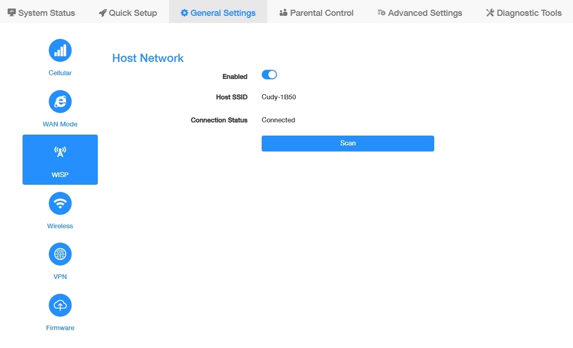 On the General Settings -> WISP page, you can enable the router to wirelessly connect to a distant Wi-Fi network and share that connection locally via Ethernet/Wi-Fi, acting as a client bridge. Please follow the steps below.