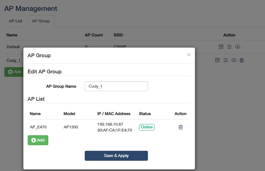 APs in the same AP group will share an identical SSID, while different AP groups should have different SSIDs. Refer to General Settings -> Wireless for more detailed configurations.