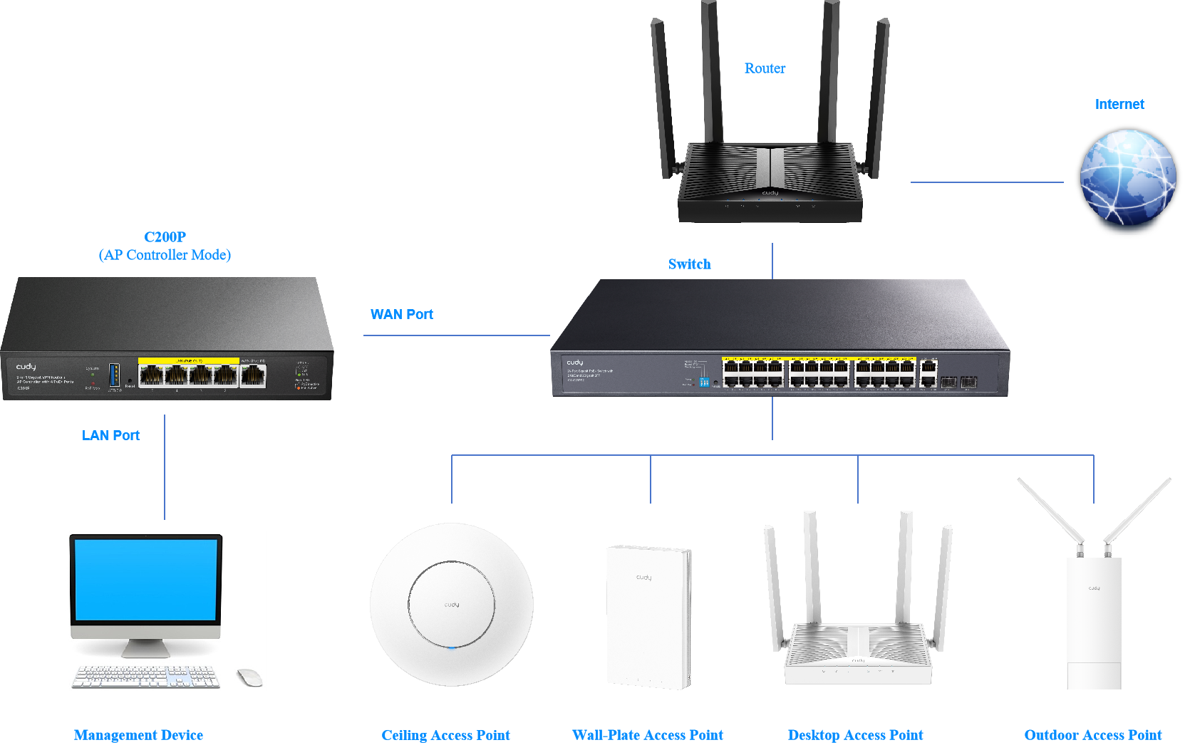 - Connect the APs to the switch or directly to the rest LAN ports of C200P.