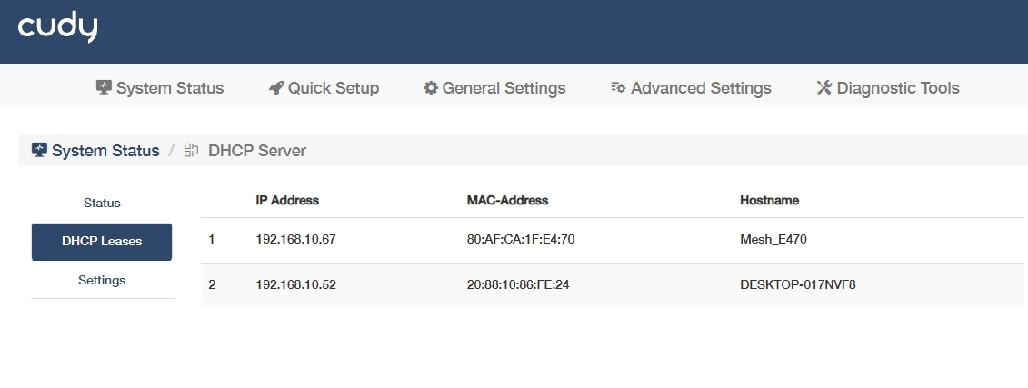 The DHCP Leases will show a list of clients which the Router being a DHCP server has allocated an IP address to, including such information as IP address, MAC address and Host name.