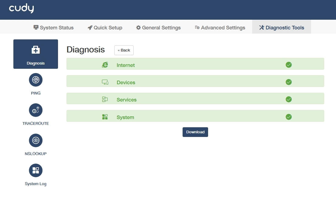 The diagnosis result will indicate the status of Internet, Devices, Services and System.