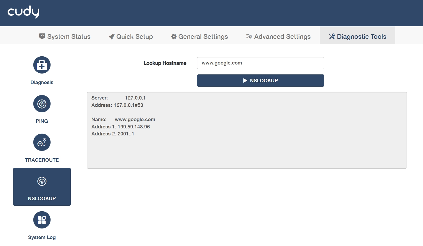 - Click NSLOOKUP to start the diagnosis. Then a result will show the resolved IP address(es) of a domain or confirms if DNS resolution is successful or fails.