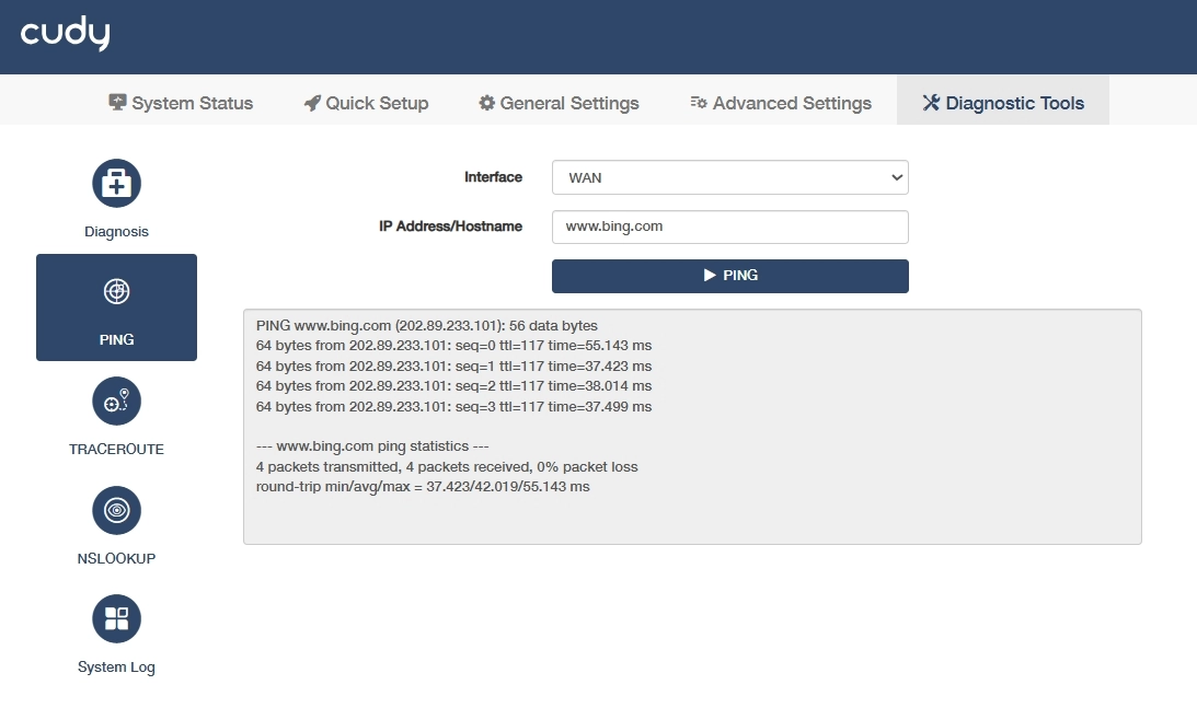 The PING result as below indicates the proper connection between the AP controller and the Bing server (www.bing.com) being tested.