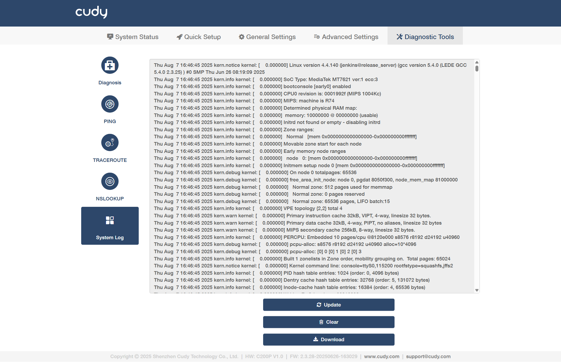 - Download: Click to download the system log for technical support.