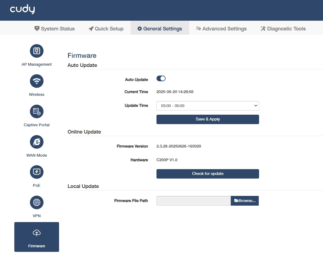 - If you miss the prompt, please go to General Settings -> Firmware to check for update. If there is one, click Update and wait a few minutes for the update and reboot to complete.