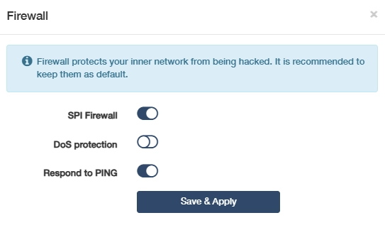 Firewall is a security system that monitors and controls incoming and outgoing network traffic based on predetermined security rules. It serves as a barrier between a trusted internal network and untrusted external networks, such as the Internet. This function is enabled by default. It is highly recommended to keep the default settings.