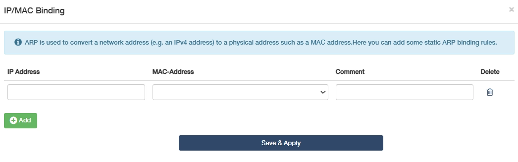 - Enter the IP Address and bind it with a MAC-Address (select from the list or enter manually), and make a comment. Delete if needed.