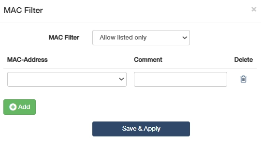 - Allow listed only: To allow only the device(s) with the listed MAC address to access the Internet.