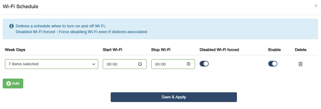 - Specify the schedules, including Week Days, Start Wi-Fi, Stop Wi-Fi.
