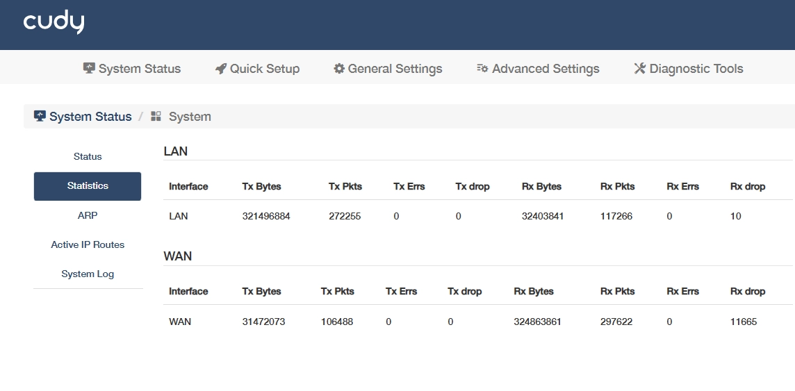 Go to System Status-> System -> More Details to know more information on the Status, Statistics, ARP, Active IP Routes and System Log.