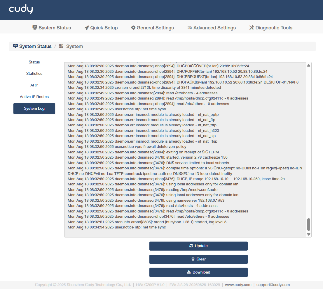 Tracks all the router behaviors. When the router does not work normally, download the system log and send it to our Technical Support for troubleshooting.