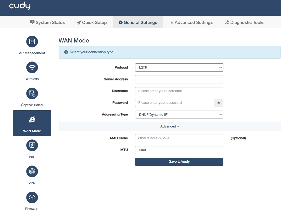 - MAC Clone: Spoof a custom MAC address on the WAN interface.