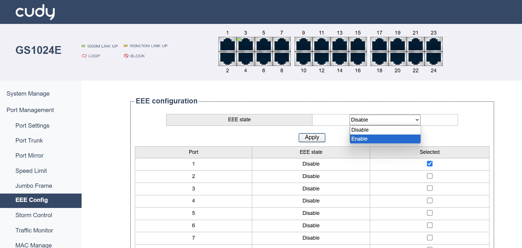 - EEE State: Select to Enable or Disable the Energy-Efficient Ethernet (EEE) state to manage power consumption.