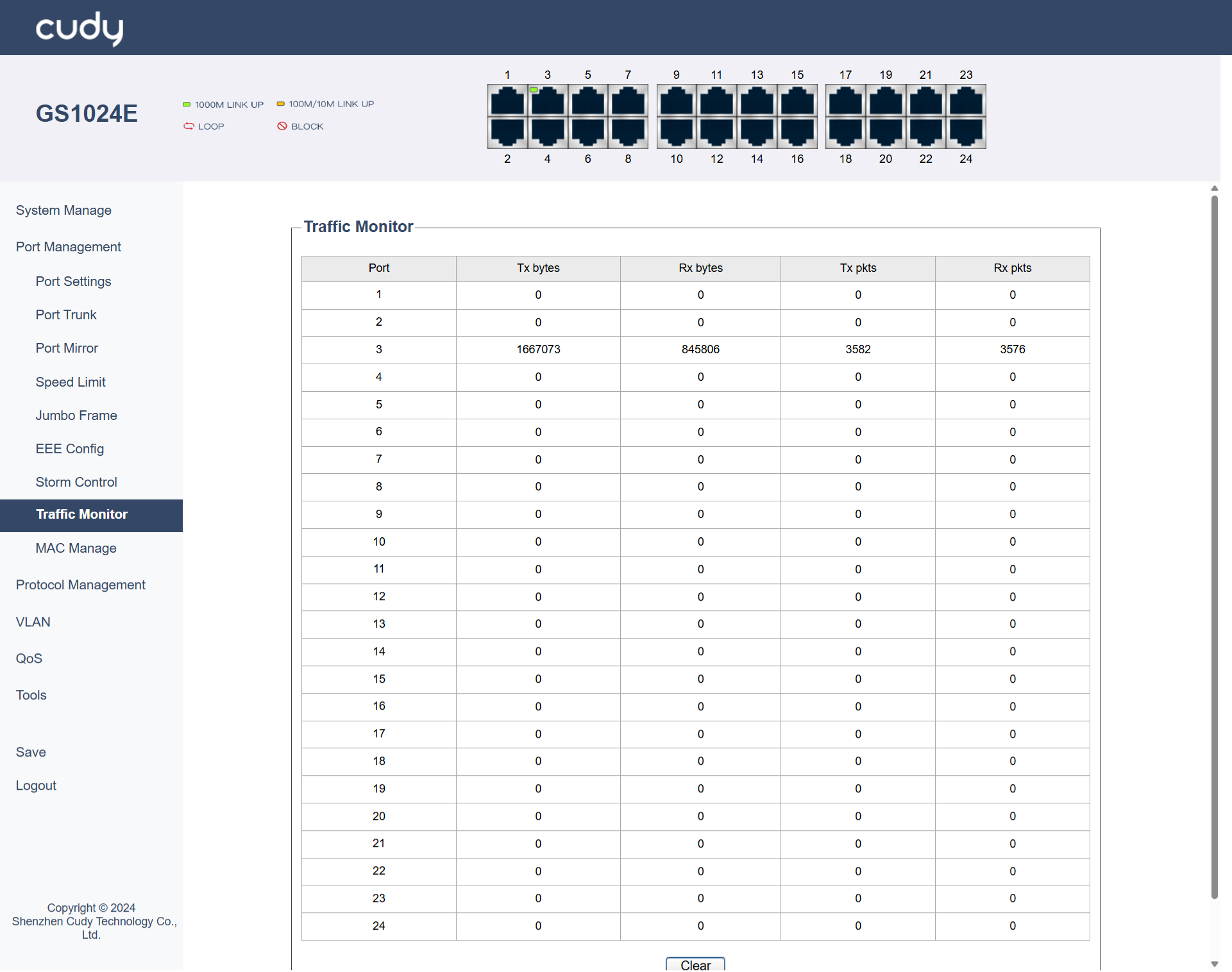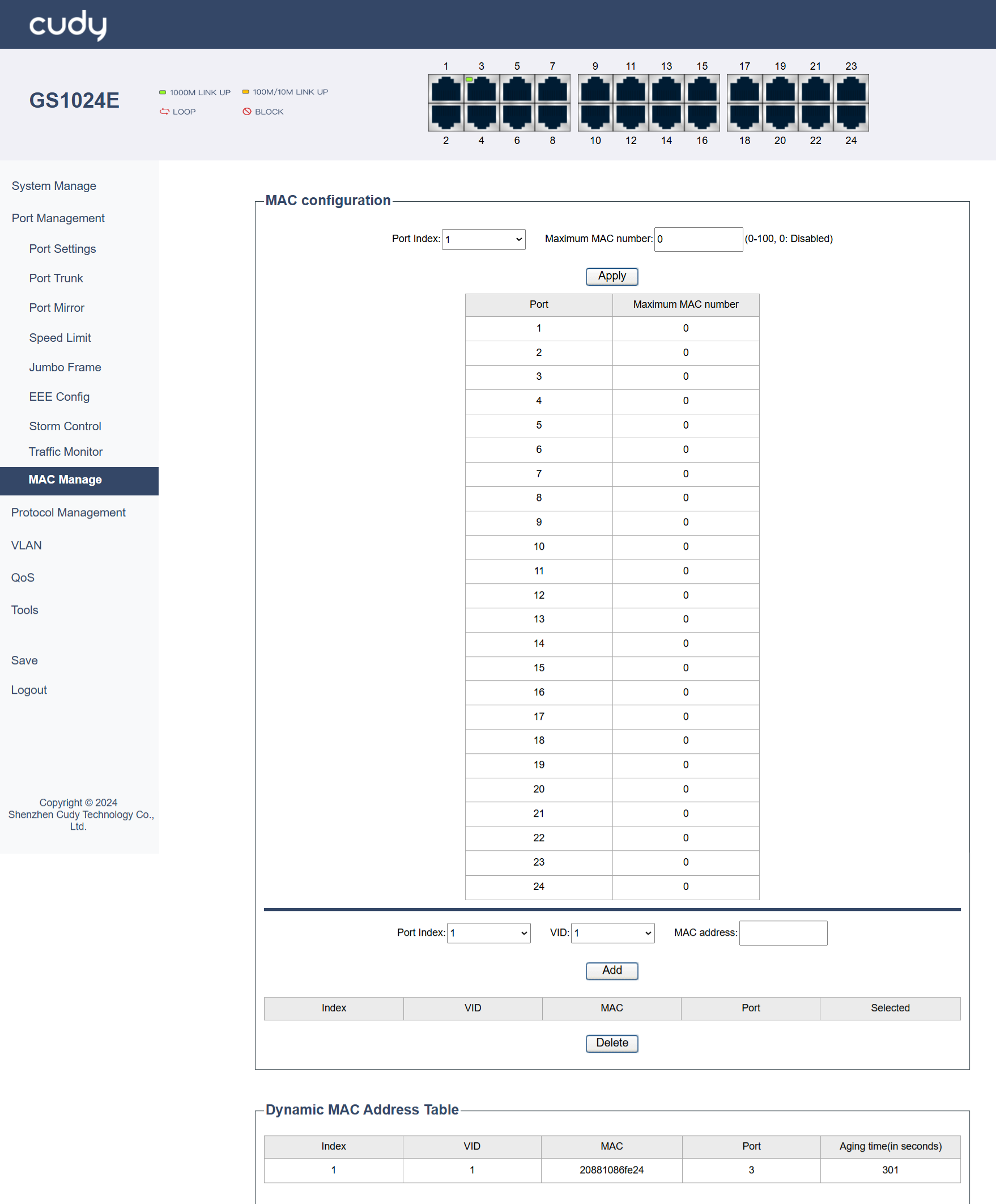 - Maximum MAC number: Set the maximum number of MAC addresses allowed on the port. 0 means disabled.