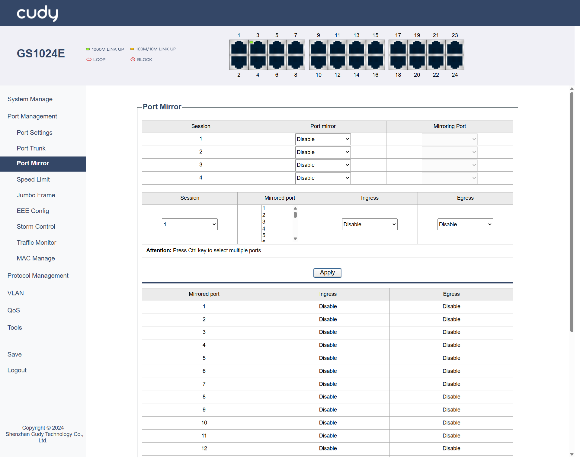 - Port Mirror: Select to Disable or Enable the Port Mirror.