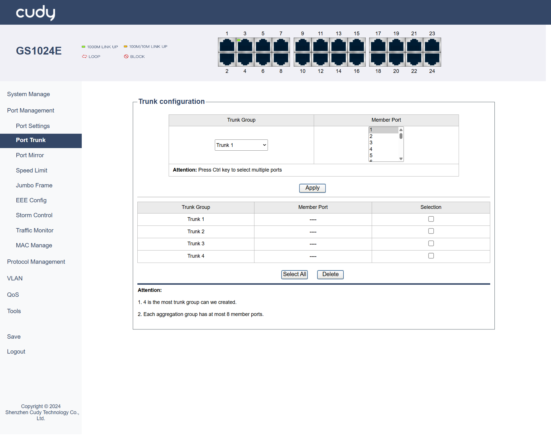 - Trunk Group: Select a group of ports that can be managed as a single logical link.