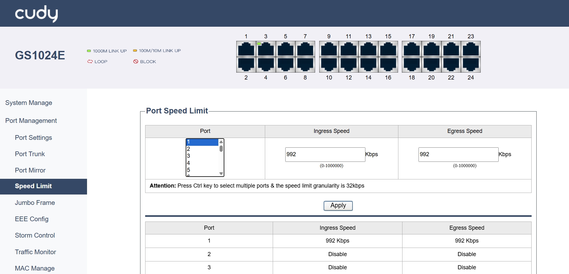 - Ingress Speed: Sets the maximum incoming data rate for the port.