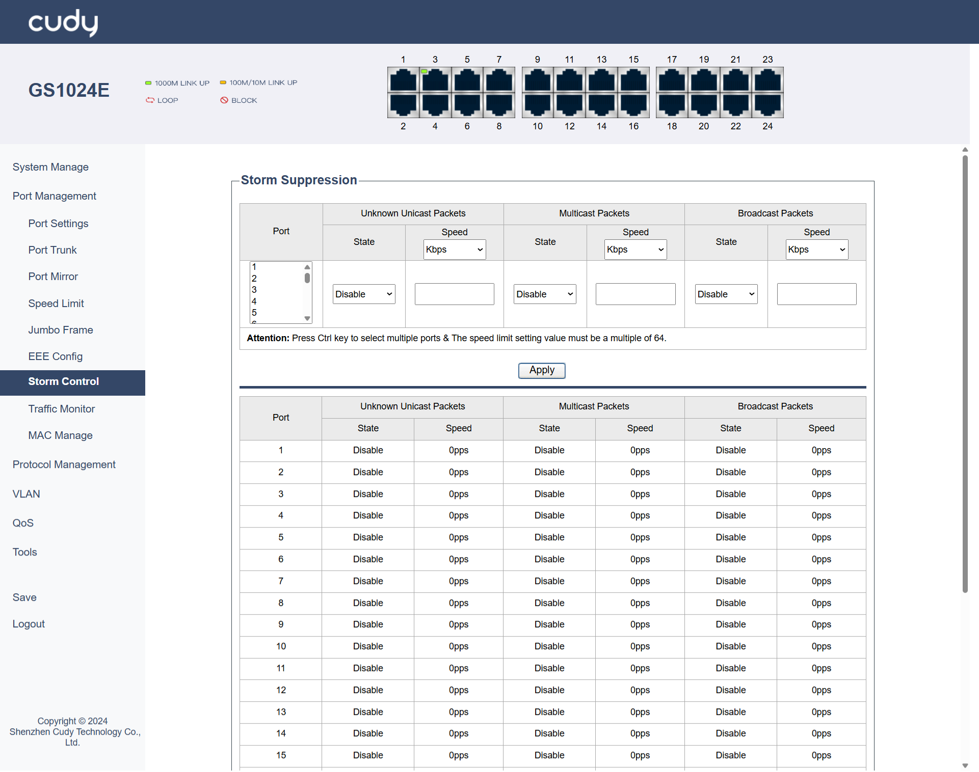 Storm Suppression manages traffic storms by limiting the rate of unknown unicast, multicast, and broadcast packets.
