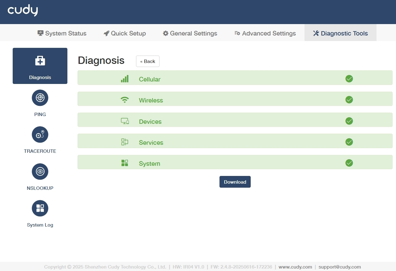 The diagnosis result will indicate the status of Cellular, Wireless, Devices, Services and System. You can click Download to reserve the diagnosis bin file.
