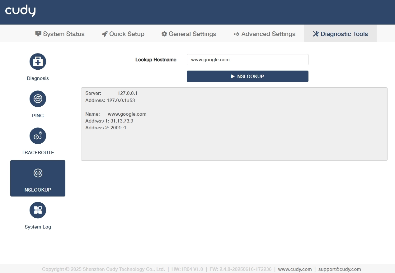 To use NSLOOKUP for diagnosis, please follow the steps below. 1. Enter the Lookup Hostname of tested host. 2. Click NSLOOKUP to start the diagnosis. The result will show as below.