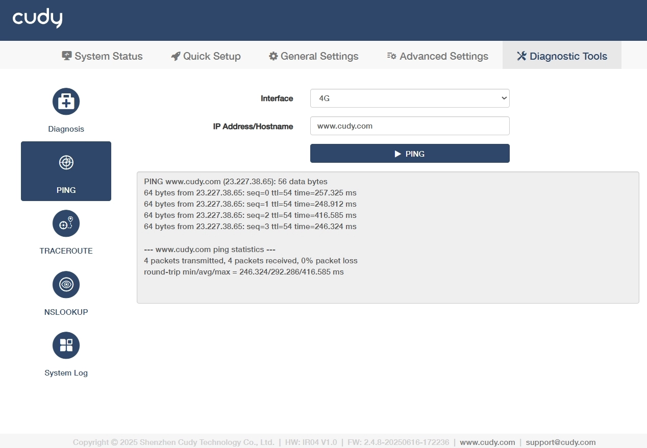 The figure below indicates the proper connection between the router and the Cudy server (www.cudy.com) tested through Ping.