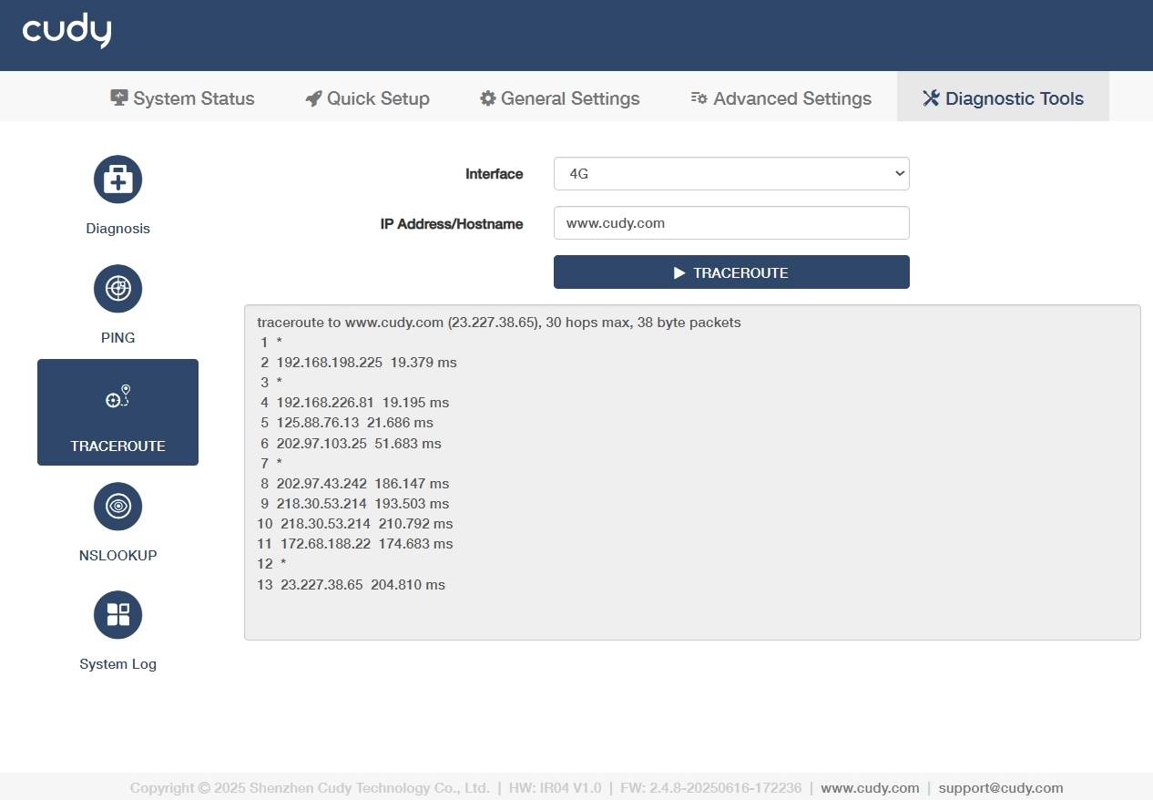 The figure below indicates the proper connection between the router and the Cudy server (www.cudy.com) tested through Traceroute.