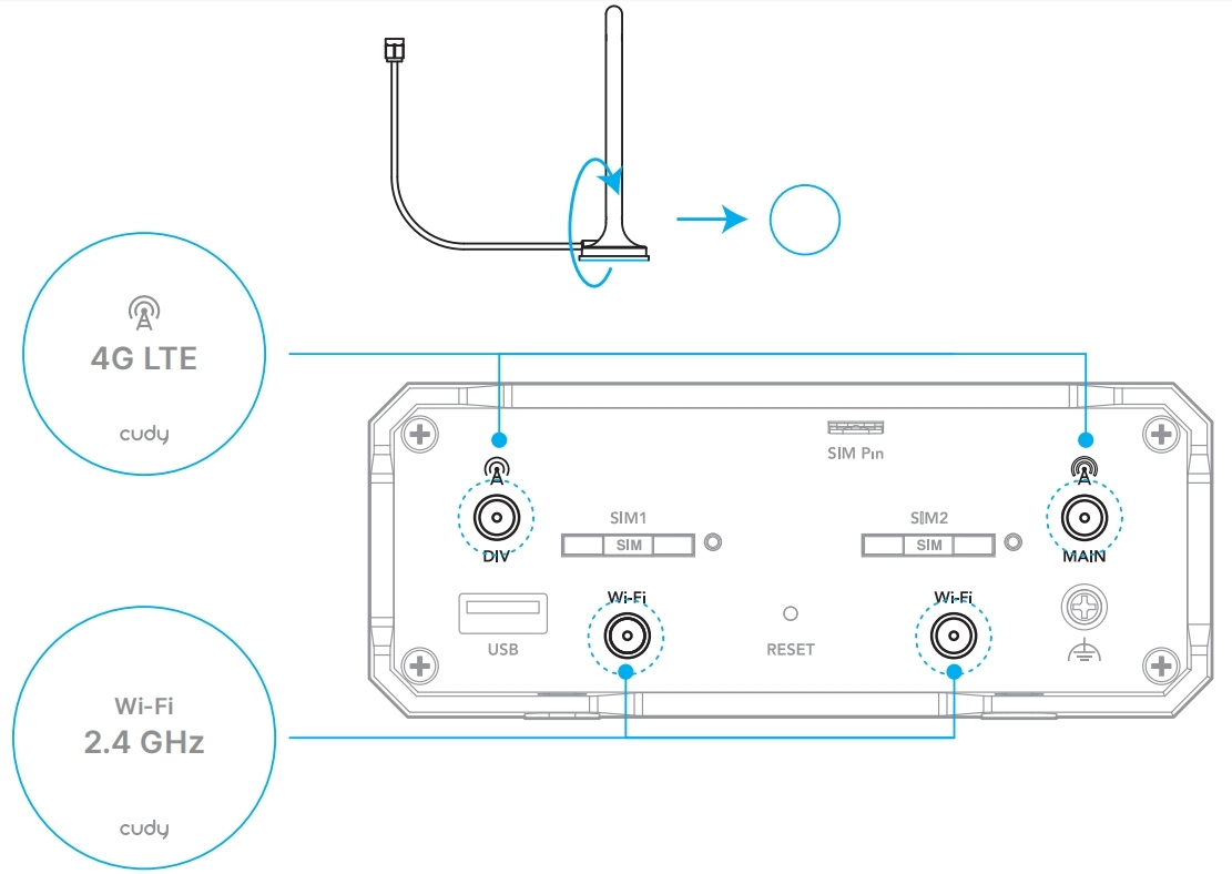 Align the gold-plated SMA connector on the antennas and the router. Screw the nut clockwise until tight.