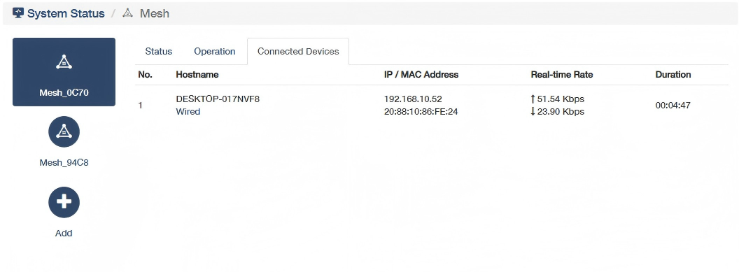 It displays information about the devices connected to the mesh unit, including hostname and its connection method, IP and MAC address, realtime rate and the connection duration.