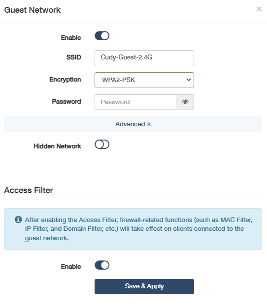 Enable Access Filter. If enabled, the firewall-related functions (such as MAC filter, IP filter, domain filter) will take effect on clients connected to the guest network.