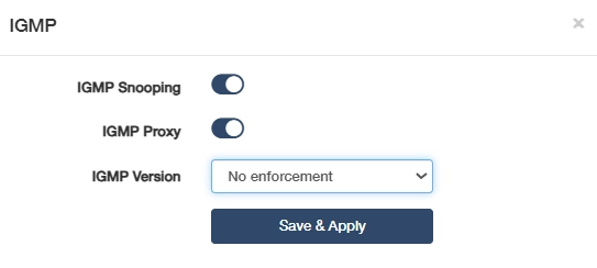 If your ISP provides the networking service based on IGMP technology (e.g.British Telecom(BT) and Talk Talk in UK), please enable IGMP Snooping and IGMP Proxy, then select the IGMP Version (No enforcement / Enforce IGMPv1 / Enforce IGMPv2 / Enforce IGMPv3) as required by your ISP. Then click Save & Apply.