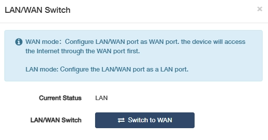 - LAN/WAN Switch: Click Switch to WAN to change working mode from LAN to WAN; or click Switch to LAN to change it from WAN to LAN.