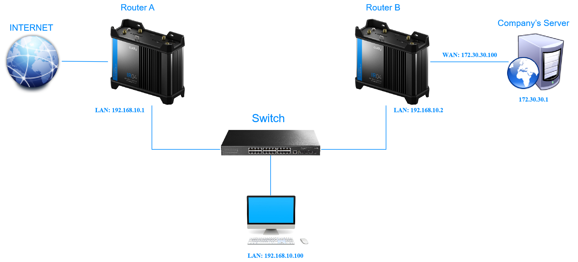 For example, I want my PC to surf the Internet through router A and visit my company's local network at the same time. Now I have a switch and router B. I connect the devices as shown in the following figure so that the physical connection between my PC and my company's server is established.