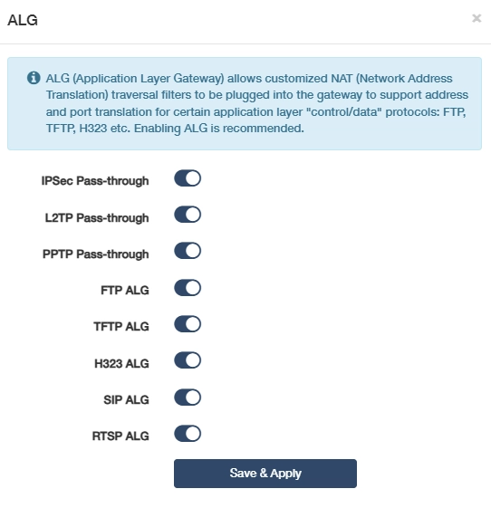 ALG (Application Layer Gateway) allows customized NAT traversal filters to be plugged into the gateway to support address and port translation for certain application layer “control/data” protocols such as FTP, TFTP, H323 etc. All ALG is enabled by default and recommended.