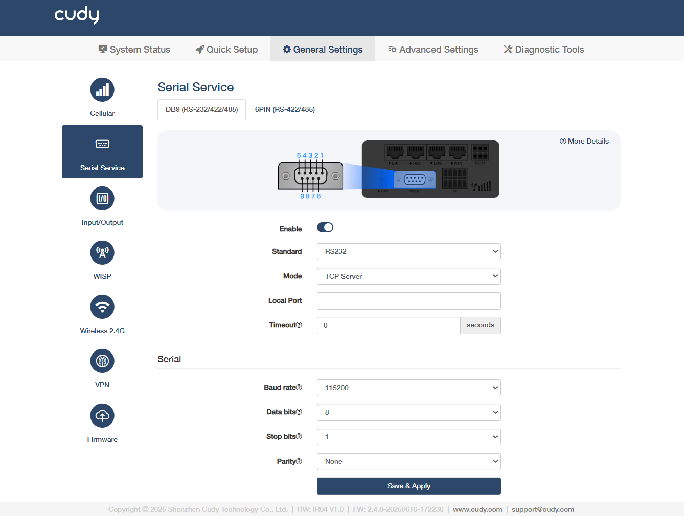 Baud rate: Select to define the speed of data transmission for serial communication, measured in bits per second (bps).