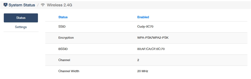 - Status: Indicates whether the 2.4GHz wireless radio is active or inactive.