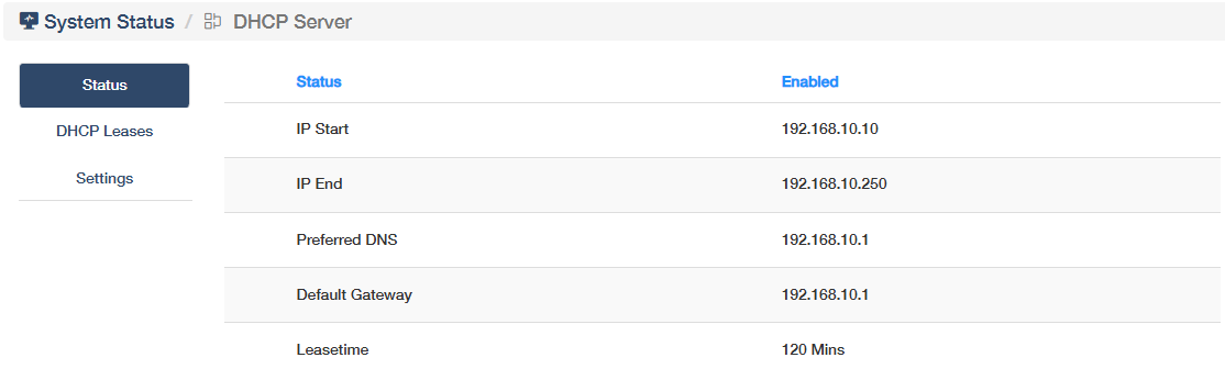 shows whether the DHCP Server is enabled or not, and its starting/ending IP. Click More Details to know more information on the Status and DHCP Leases sub-pages, or configure some settings (refer to DHCP Server).