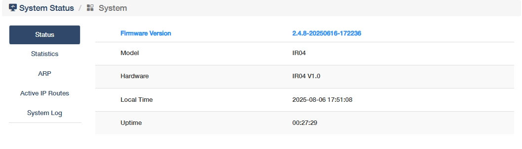 shows the router's firmware version, current local time and uptime. Click More Details to know more information on the Status, Statistics, ARP, Active IP Routes and System Log sub-pages.