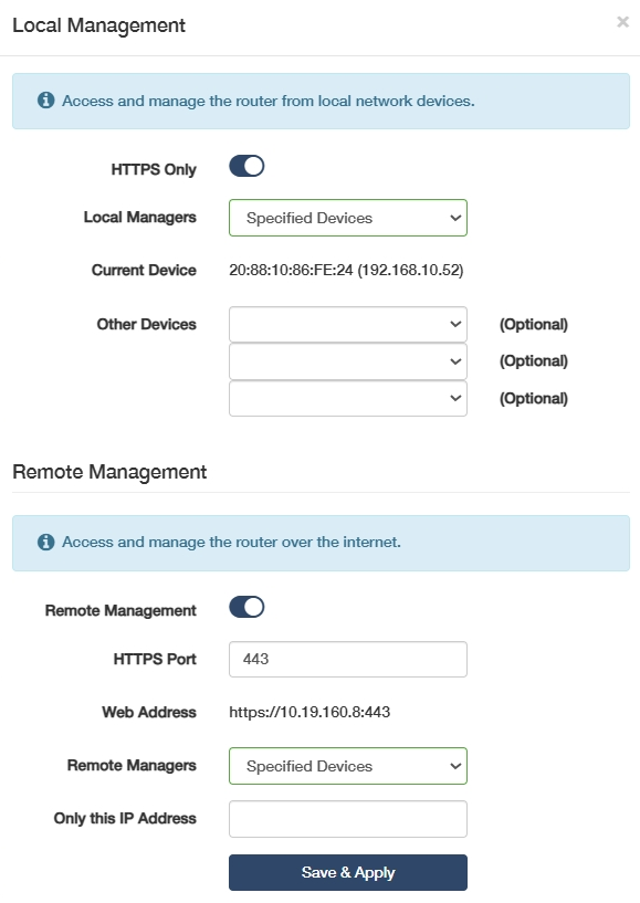 allows you to access and manage the router from the local network devices via Local Management, and access and manage the router over the Internet via Remote Management.