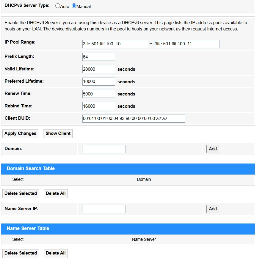 - Show Clients: Click to view all the Active DHCPv6 Clients with the assigned IP address, DUID and expired time for each DHCP leased client.