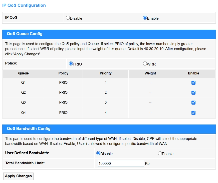 - If select Policy WRR, enter the weight number (default is 40:30:20:10) for the queue and tick Enable behind it.