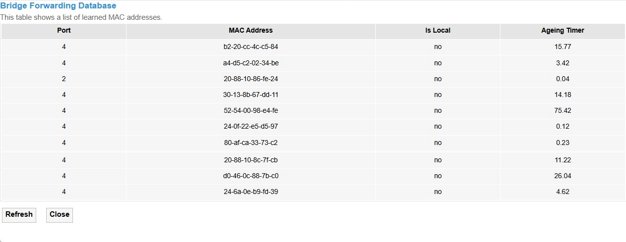 - Show MACs: Click to view the Bridge Forwarding Database with information about Port, MAC Address, Local, Ageing Timer.