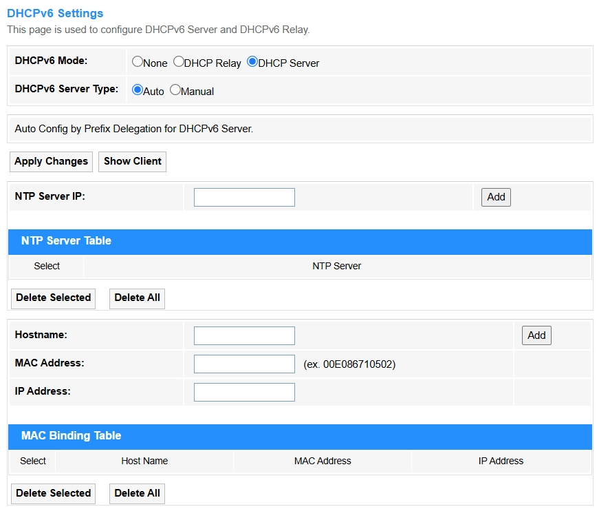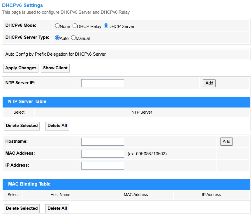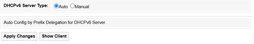 Show Clients: Click to view all the Active DHCPv6 Clients with the assigned IP address, DUID and expired time for each DHCP leased client.